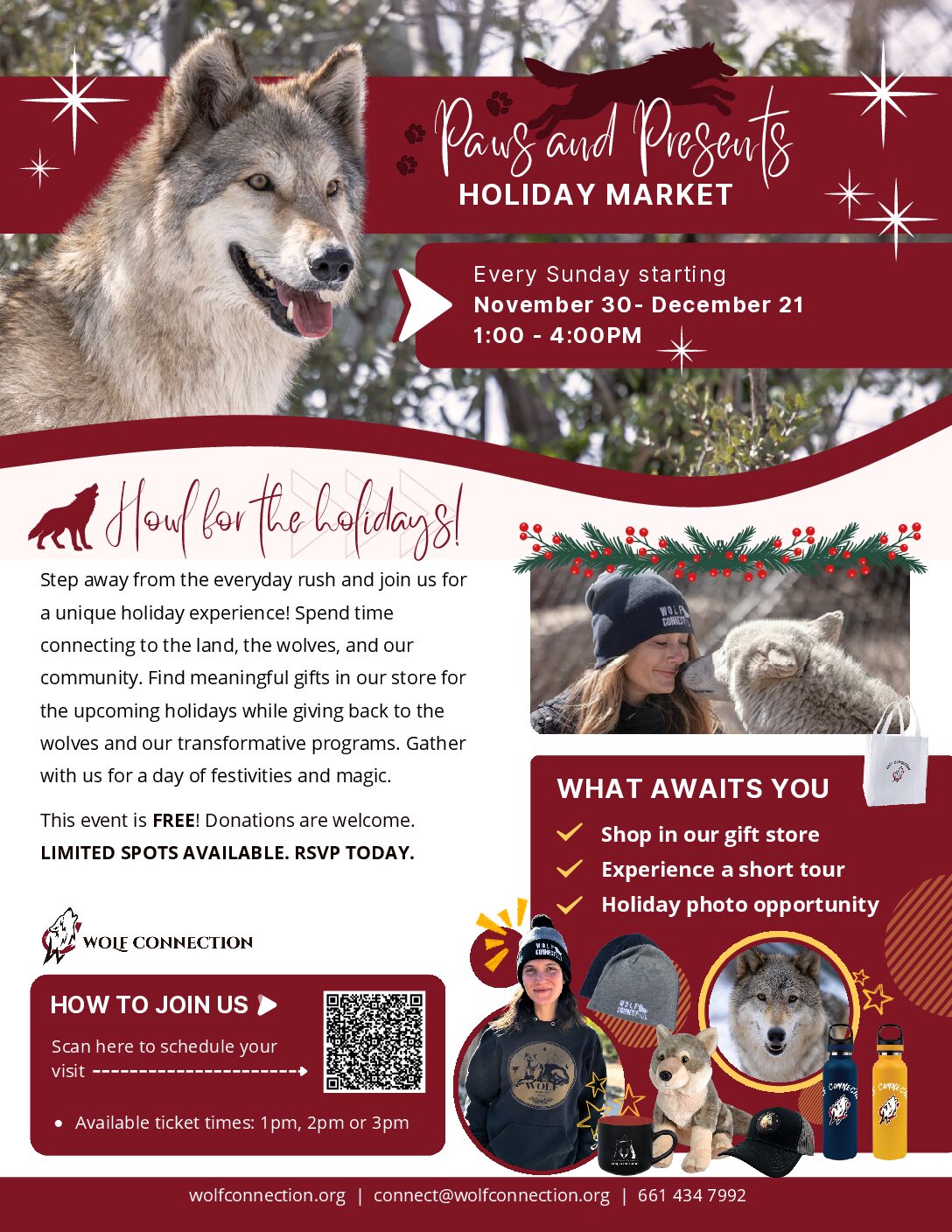 Join us for a time of connection, community and holiday cheer! Join us for a free Holiday Market filled with connection, community, and the spirit of giving, where you can explore the sanctuary, meet the pack, and discover unique gifts that give back to the wolves and programs that transform lives. 🎁 Discover one-of-a-kind gifts […] |